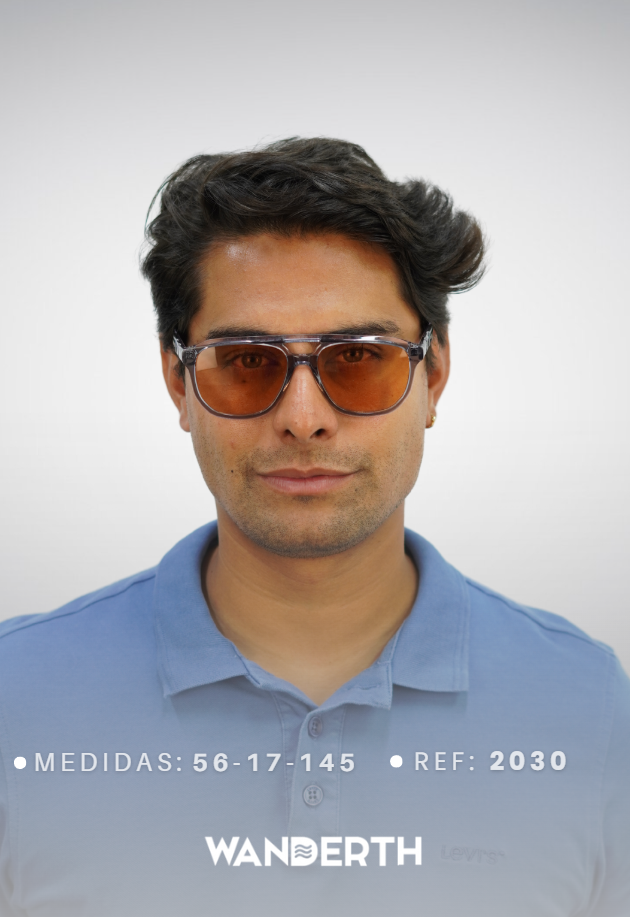 Marco negro con capa superior marrón + lente azul, Marco azul con detalles miel + lente azul claro, Marco gris translúcido + lente amarillo neón, Marco gris translúcido + lente naranja