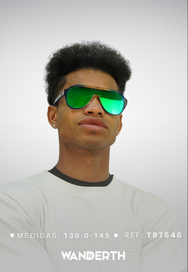 | Color | Lente rojo espejo + marco azul petróleo, Lente azul turquesa espejo + marco negro, Lente gris humo + marco negro, Lente dorado ámbar + marco negro, Lente verde–azul espejo + marco azul marino |
